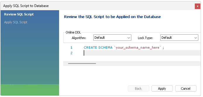 CREATE SCHEMA? That is the SQL script that was automatically generated by Workbench when you clicked Apply. This is important because changes to your database won't happen until that code runs. -