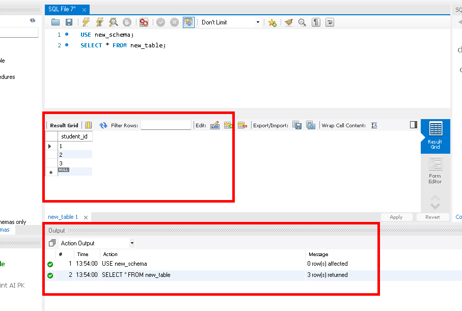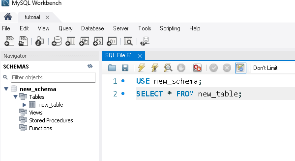 USE name_of_your_schema; SELECT * FROM name_of_your_table;Replace the placeholder names with the actual names of your schema and table.