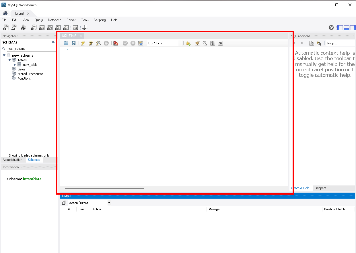 The area highlighted in red is your SQL Editor. This is where you write and run queries: